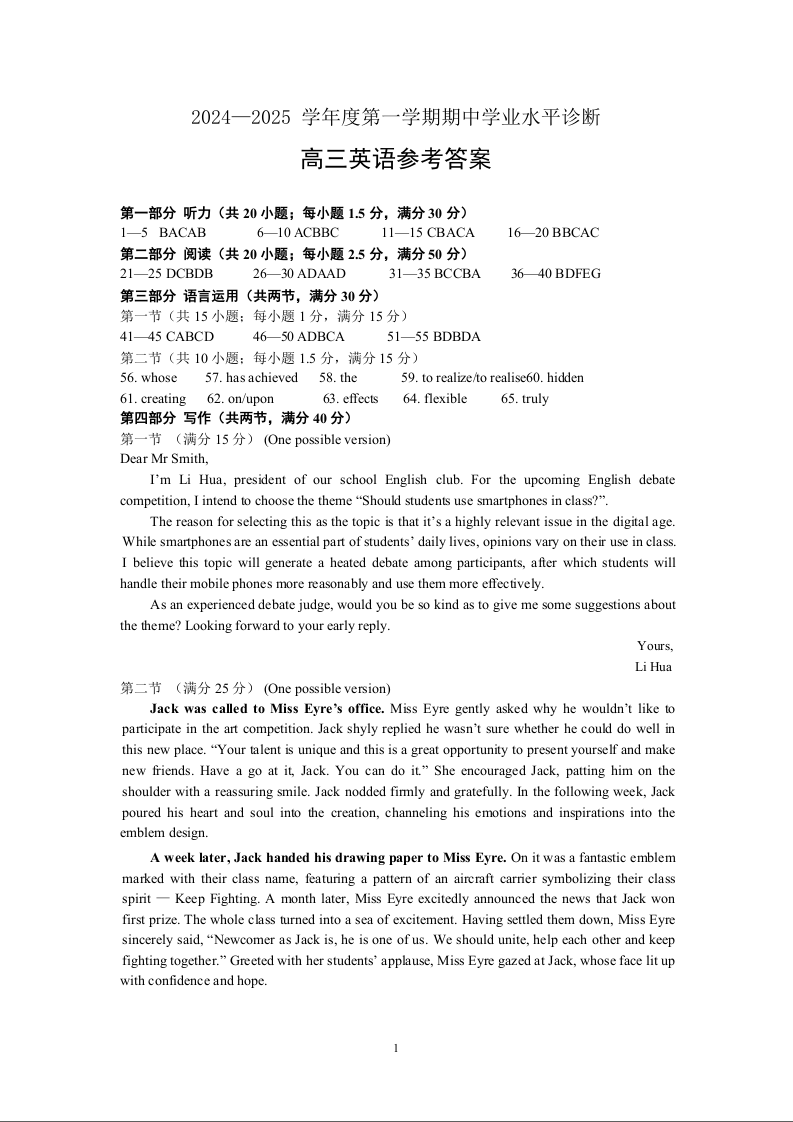 山东省烟台市2024-2025学年度第一学期期中学业水平诊断+英语答案
