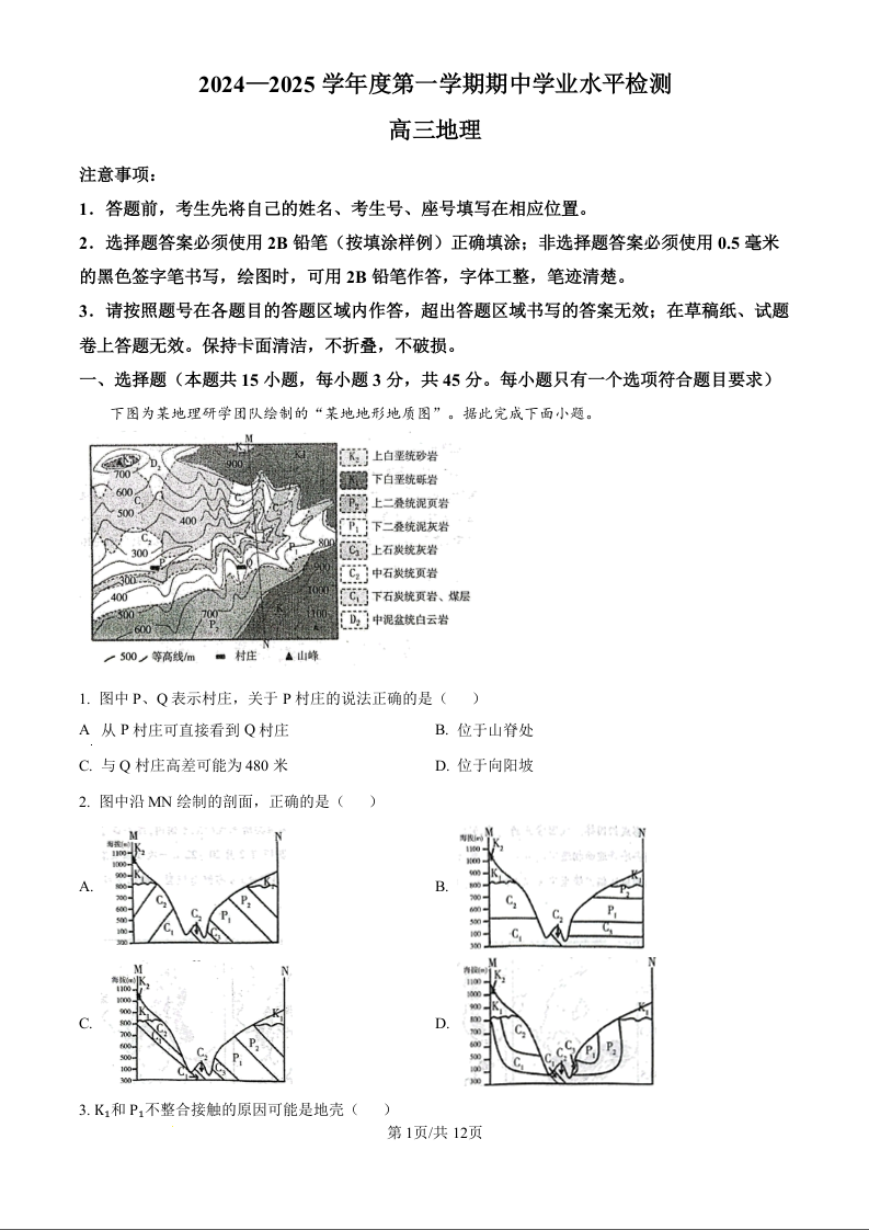 山东省烟台市2024-2025学年度第一学期期中学业水平诊断+地理答案