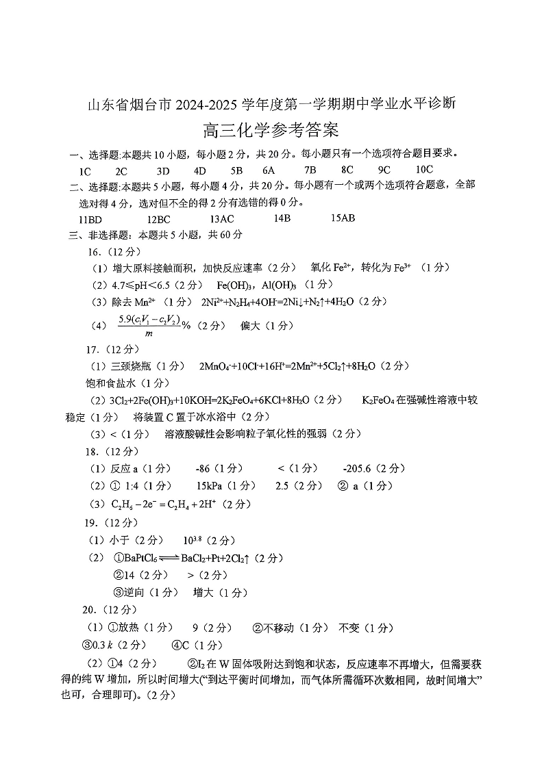 山东省烟台市2024-2025学年度第一学期期中学业水平诊断+化学答案