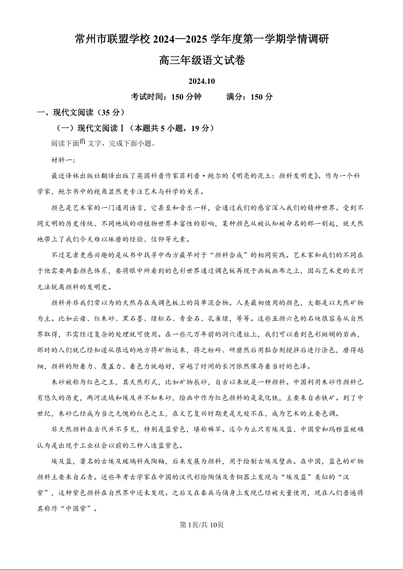 江苏省常州市联盟学校2025届高三上学期10月月考+语文