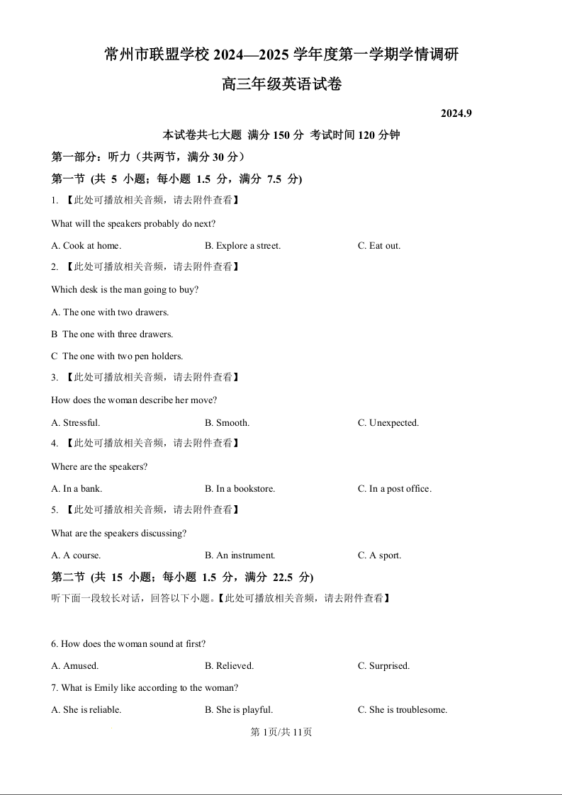 江苏省常州市联盟学校2025届高三上学期10月月考+英语