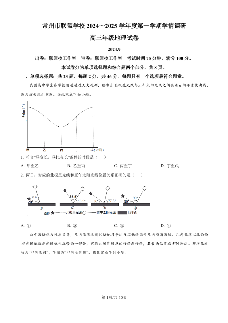 江苏省常州市联盟学校2025届高三上学期10月月考+地理