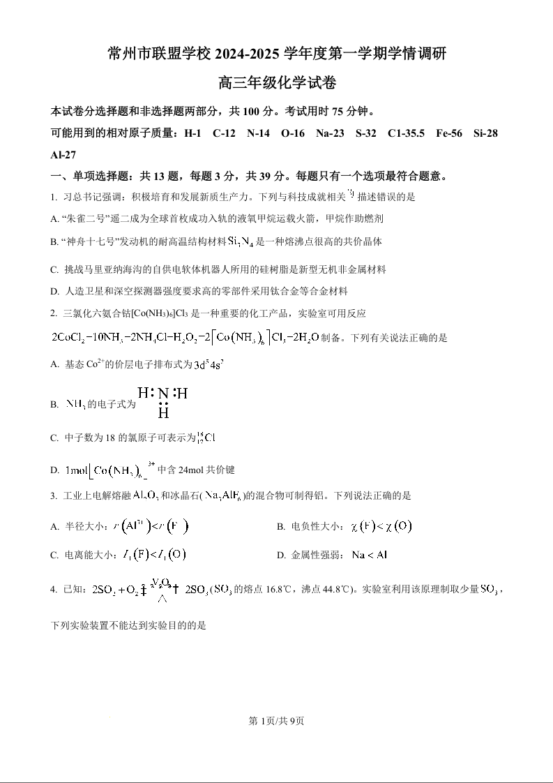 江苏省常州市联盟学校2025届高三上学期10月月考+化学