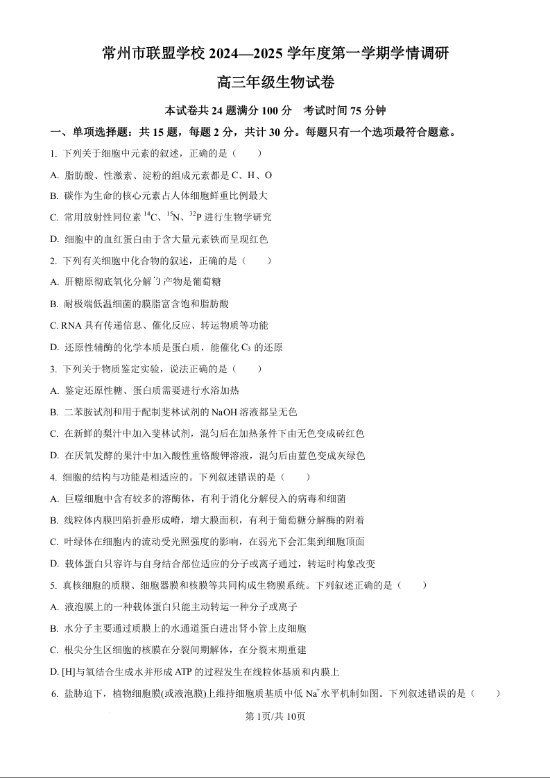 江苏省常州市联盟学校2025届高三上学期10月月考+生物