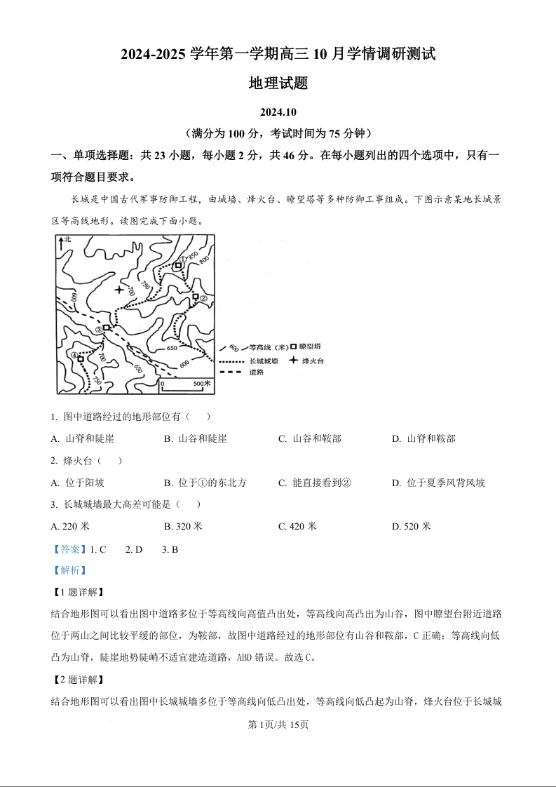 江苏省高邮市2025届高三上学期10月学情调研测试+地理答案