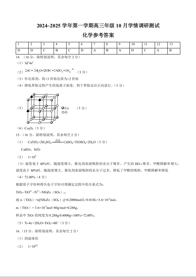 江苏省高邮市2025届高三上学期10月学情调研测试+化学答案