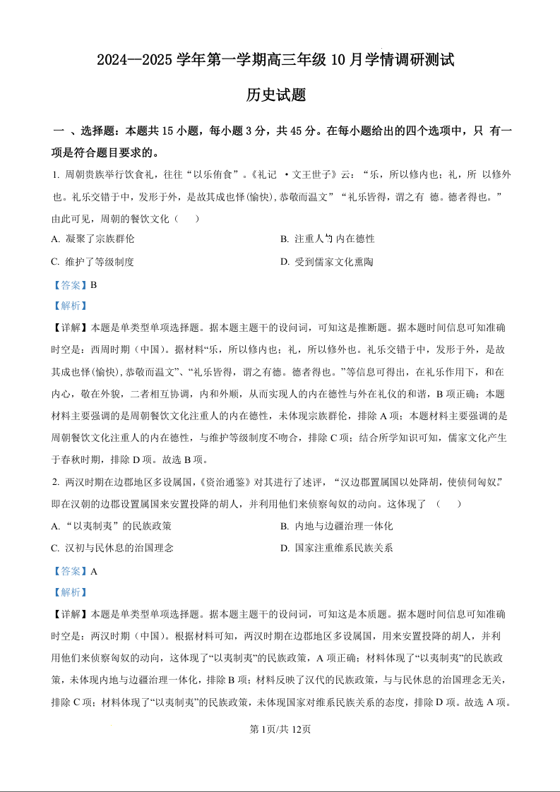 江苏省高邮市2025届高三上学期10月学情调研测试+历史答案
