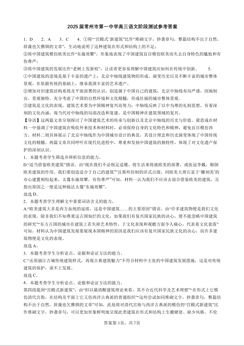 常州市第一中学2024-2025学年第一学期10月阶段测试+语文答案