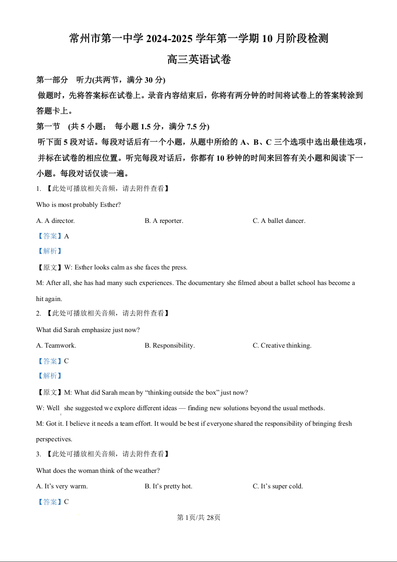 常州市第一中学2024-2025学年第一学期10月阶段测试+英语答案