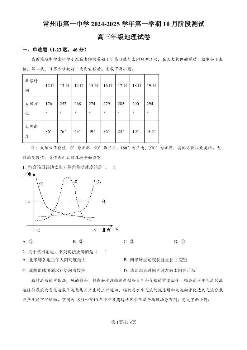 常州市第一中学2024-2025学年第一学期10月阶段测试+地理