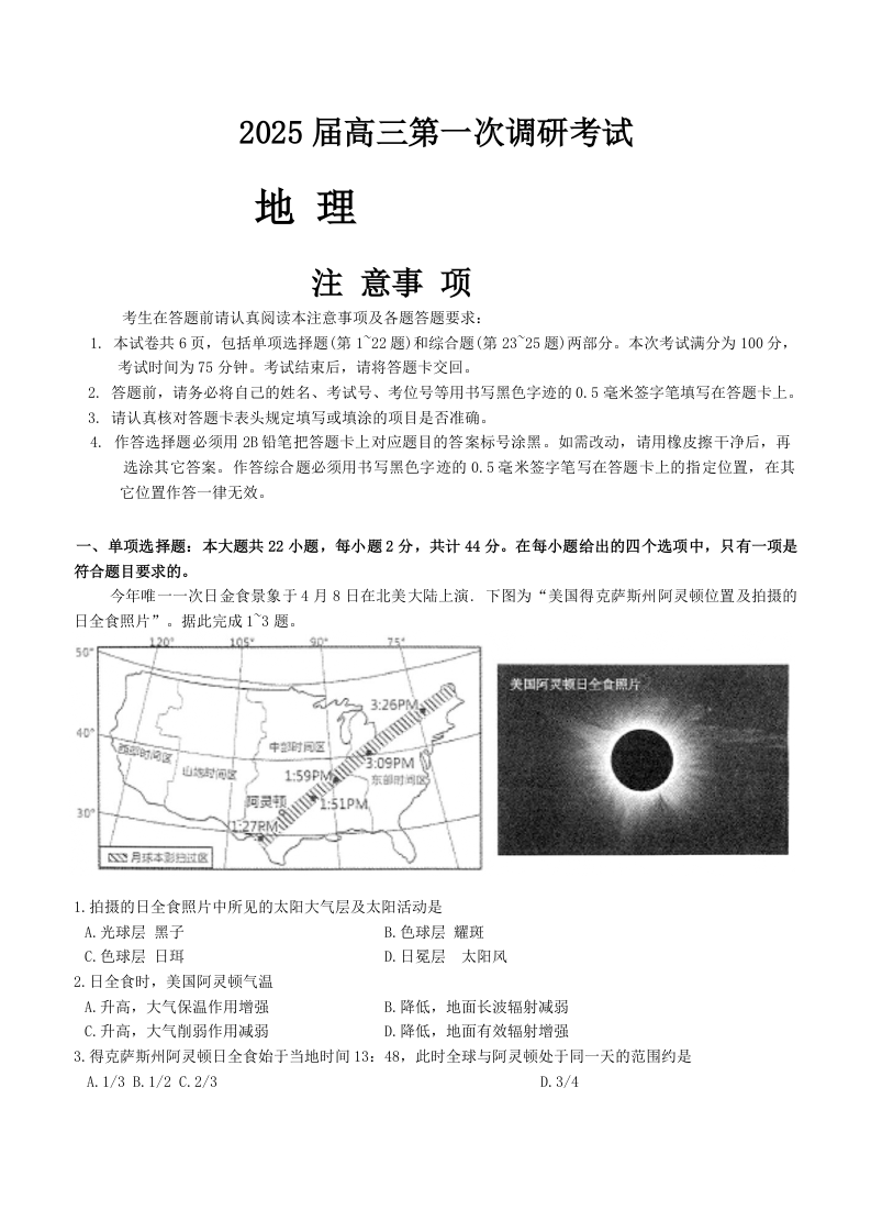 南通海门中学2025届高三上学期第一次调研考试+地理