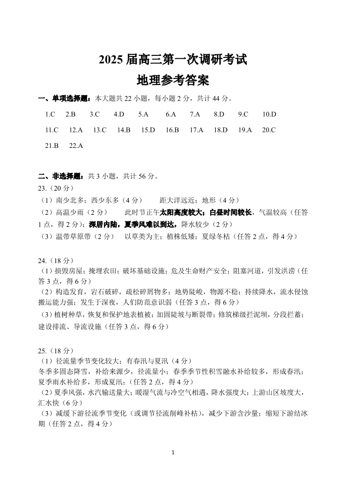 南通海门中学2025届高三上学期第一次调研考试+地理答案