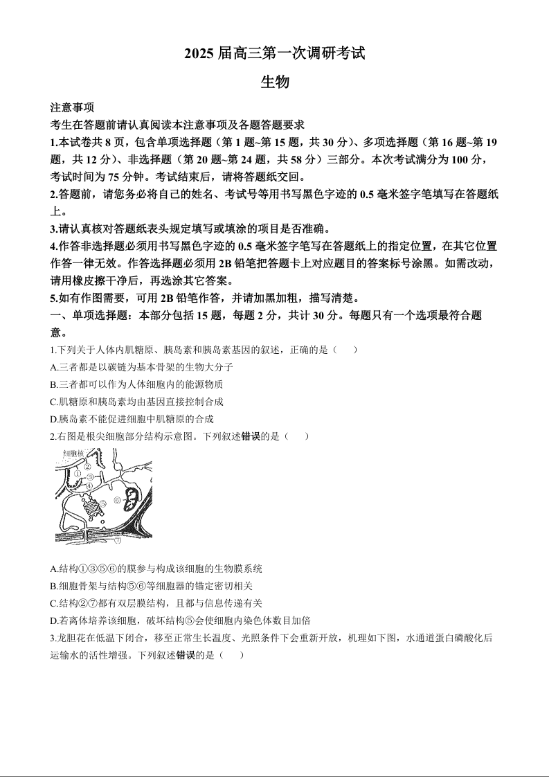 南通海门中学2025届高三上学期第一次调研考试+生物