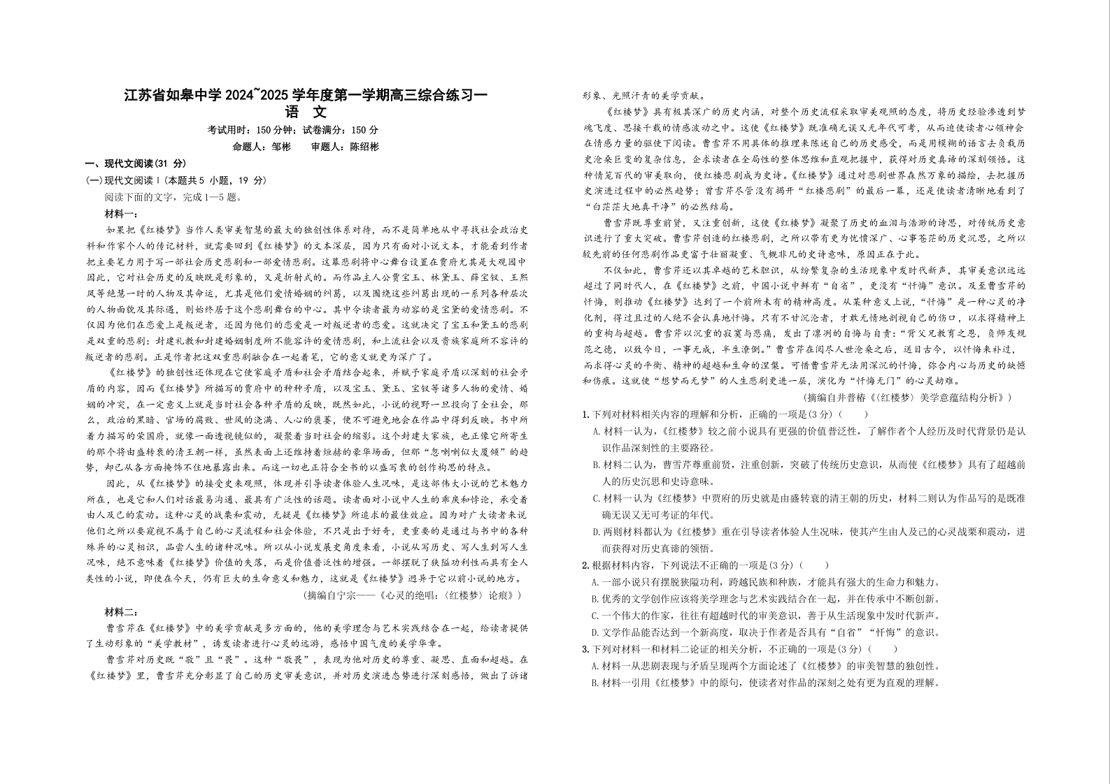 江苏省如皋中学2024-2025学年高三上学期综合练习(一)+语文