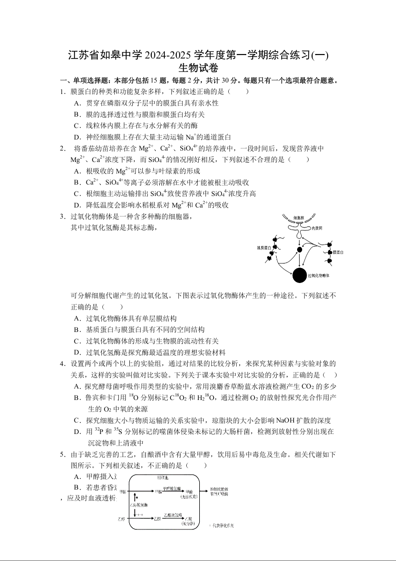 江苏省如皋中学2024-2025学年高三上学期综合练习(一)+生物