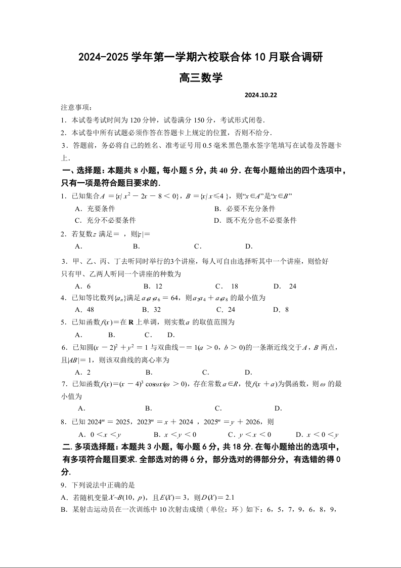 2024-2025学年第一学期六校联合体10月联合调研+数学