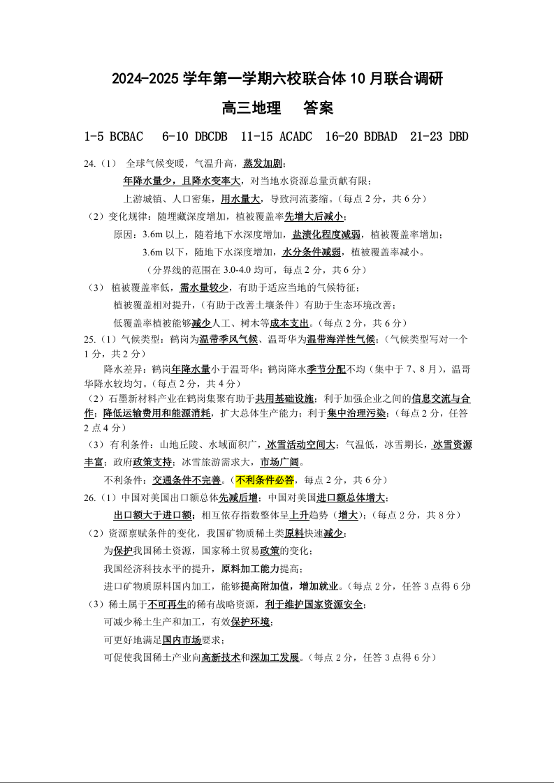 2024-2025学年第一学期六校联合体10月联合调研+地理答案