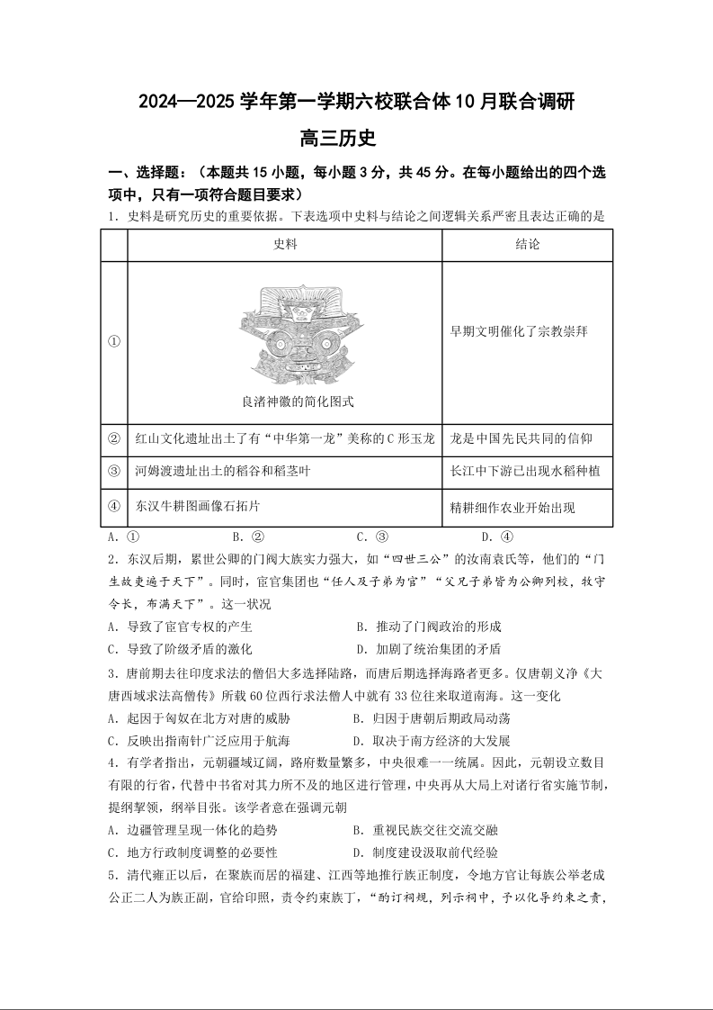 2024-2025学年第一学期六校联合体10月联合调研+历史