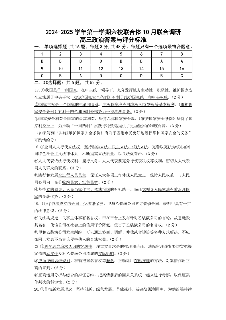 2024-2025学年第一学期六校联合体10月联合调研+政治答案
