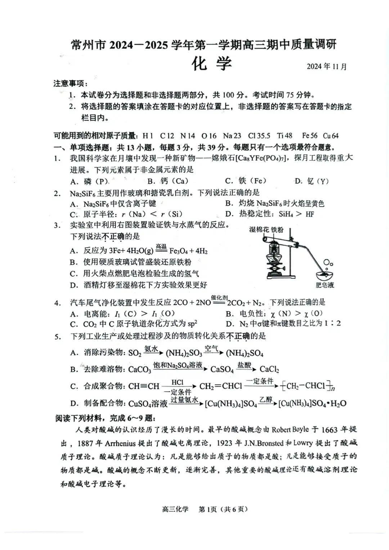 江苏省常州市2024-2025学年高三上学期期中考试+化学