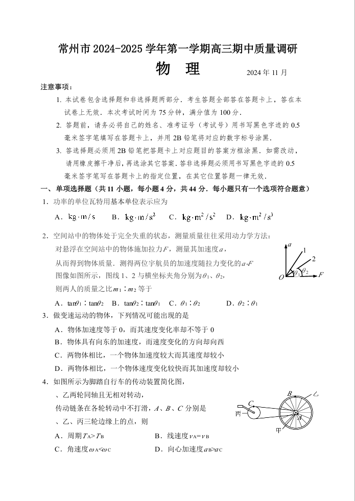 江苏省常州市2024-2025学年高三上学期期中考试+物理