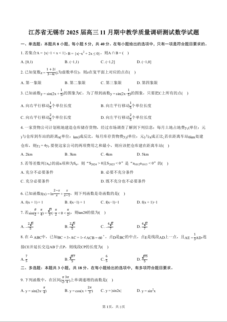 江苏省无锡市2025届高三11月期中教学质量调研测试+数学