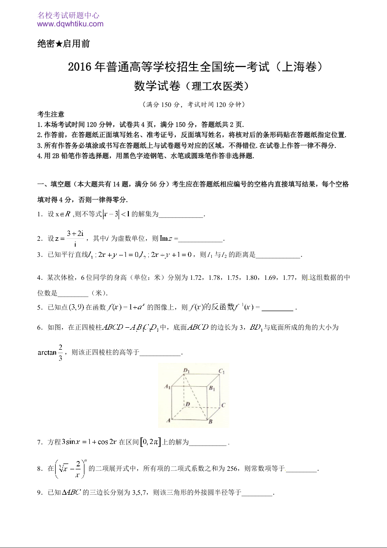 2016年上海高考数学真题(理科)试卷(word解析版)