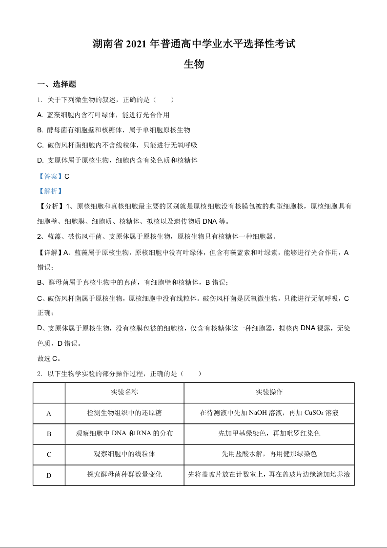 2021年高考生物真题(湖南卷)答案