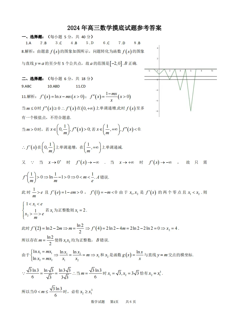 河北省保定市2025届高三摸底考试(保定一模)数学答案
