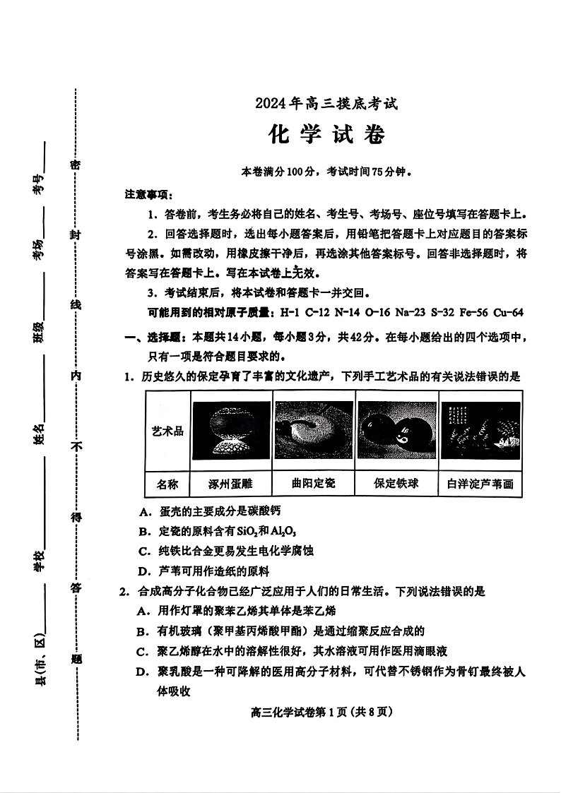 河北省保定市2025届高三摸底考试(保定一模)化学