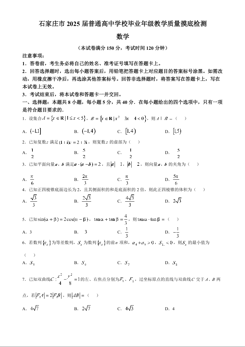 河北省石家庄市2025届高三上学期教学质量摸底检测数学试卷+答案