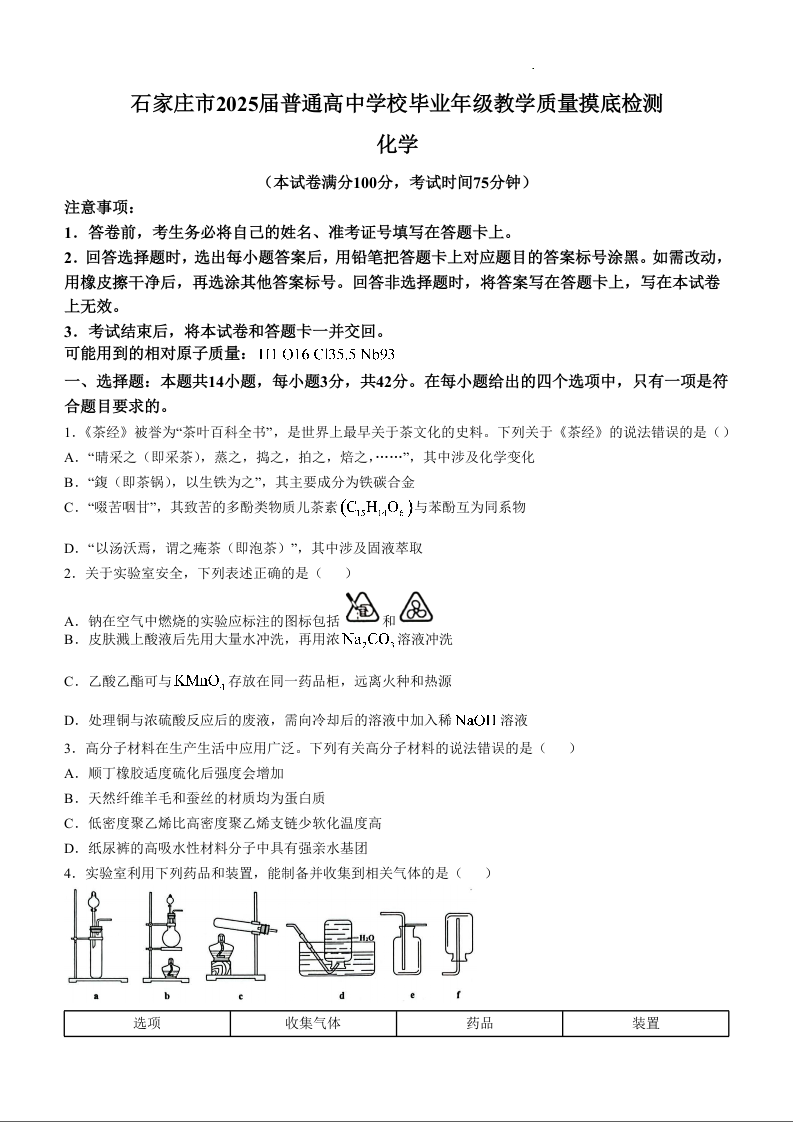 河北省石家庄市2025届高三上学期教学质量摸底检测化学试卷+答案