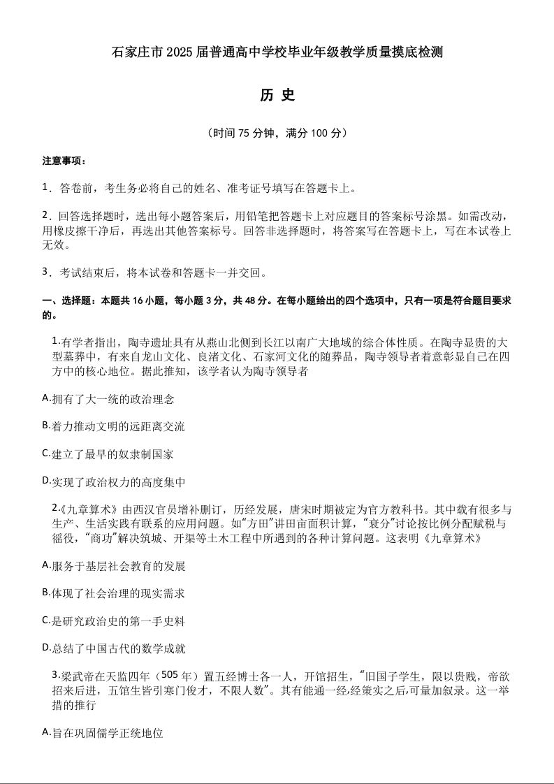 河北省石家庄市2025届高三上学期教学质量摸底检测历史试卷+答案
