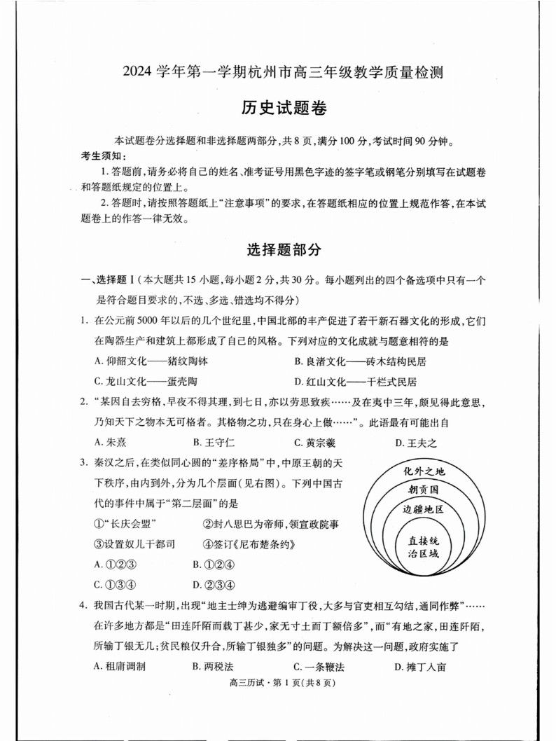 浙江省2025届高三杭州一模历史试题