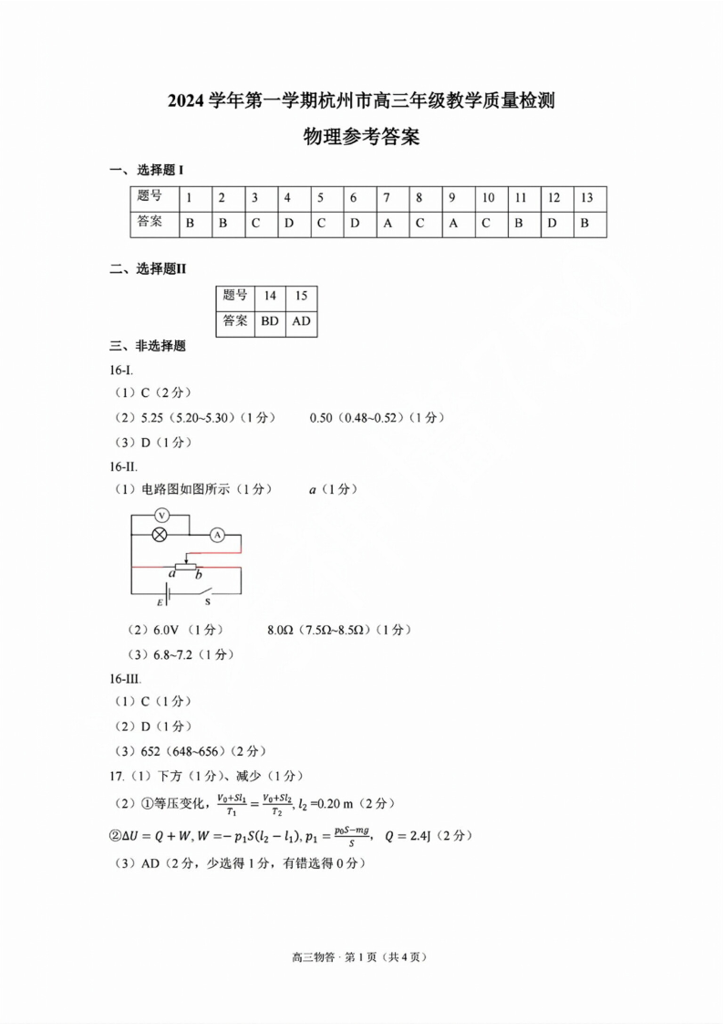 浙江省2025届高三杭州一模物理答案