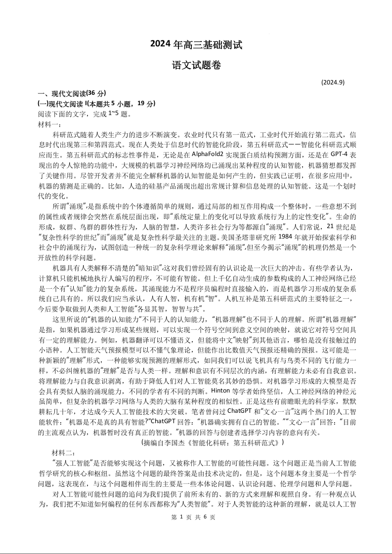 浙江省嘉兴市2024-2025学年高三基础测试+语文