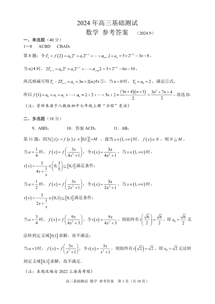 浙江省嘉兴市2024-2025学年高三基础测试+数学答案