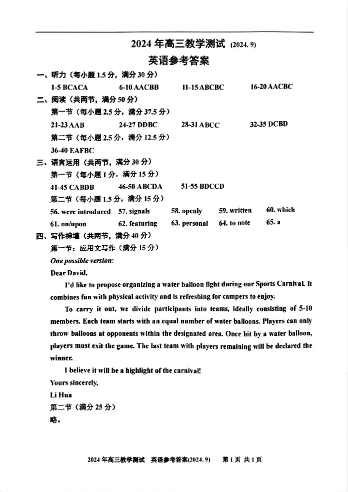 浙江省嘉兴市2024-2025学年高三基础测试+英语答案
