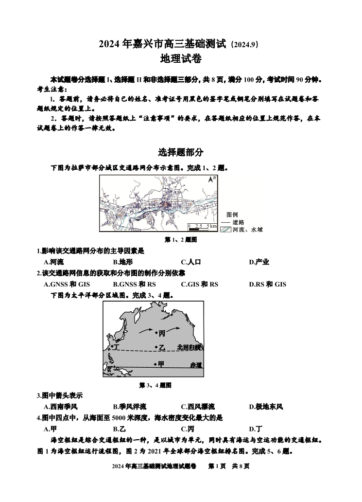 浙江省嘉兴市2024-2025学年高三基础测试+地理