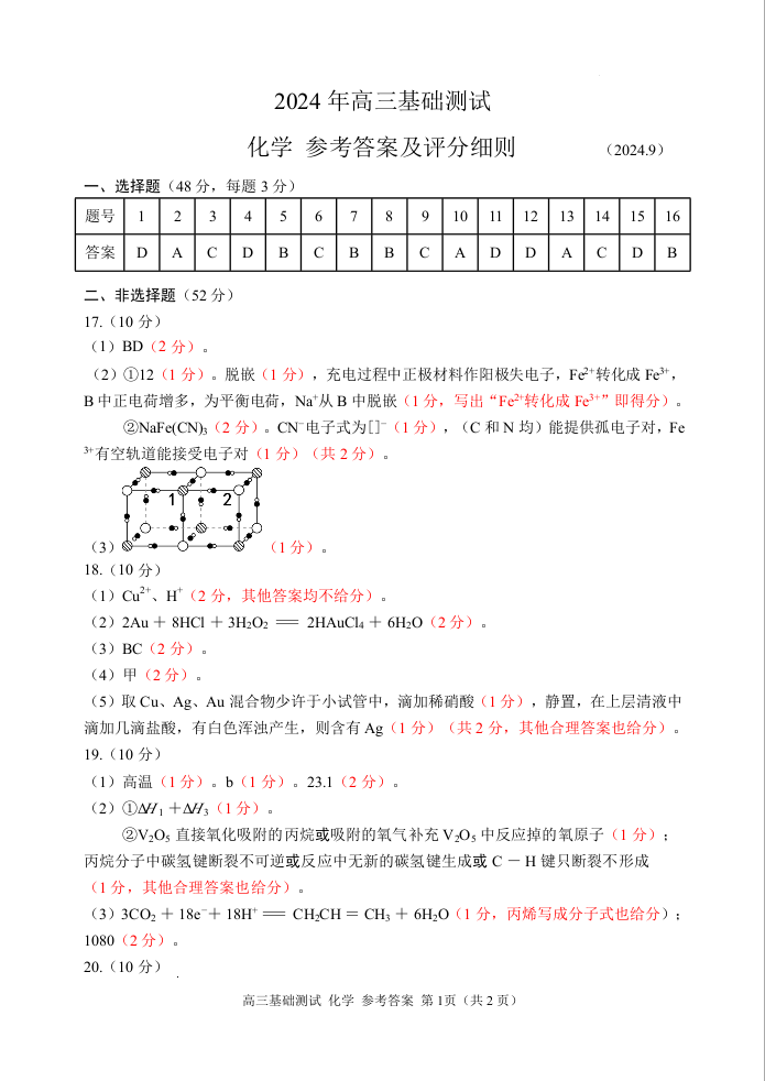 浙江省嘉兴市2024-2025学年高三基础测试+化学答案