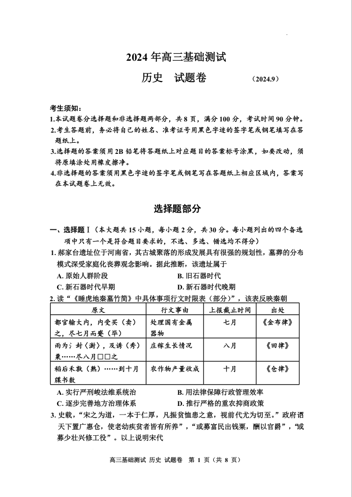 浙江省嘉兴市2024-2025学年高三基础测试+历史