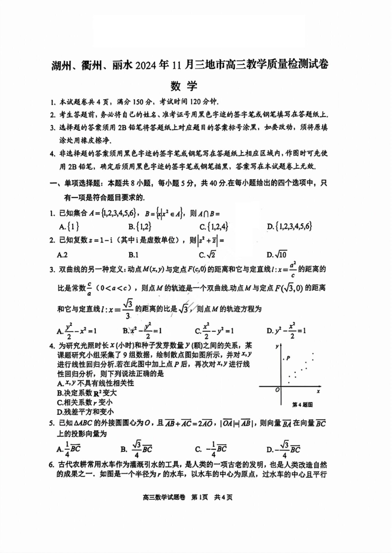 浙江省湖丽衢2024年11月三地市教学质量检测试卷+数学