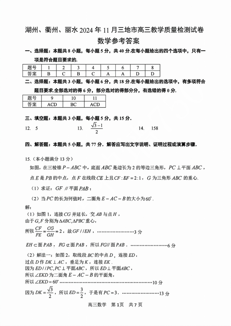 浙江省湖丽衢2024年11月三地市教学质量检测试卷+数学答案