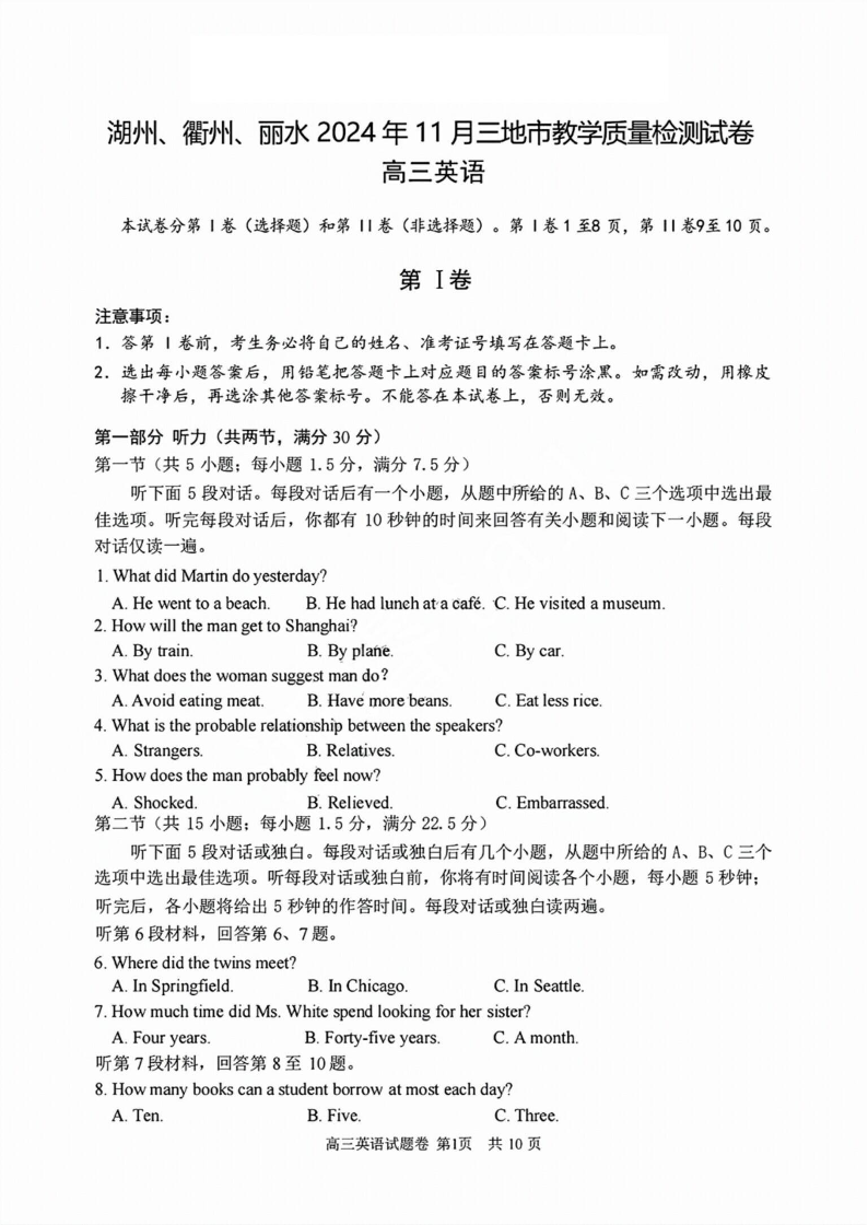 浙江省湖丽衢2024年11月三地市教学质量检测试卷+英语