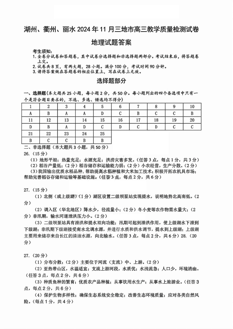 浙江省湖丽衢2024年11月三地市教学质量检测试卷+地理答案