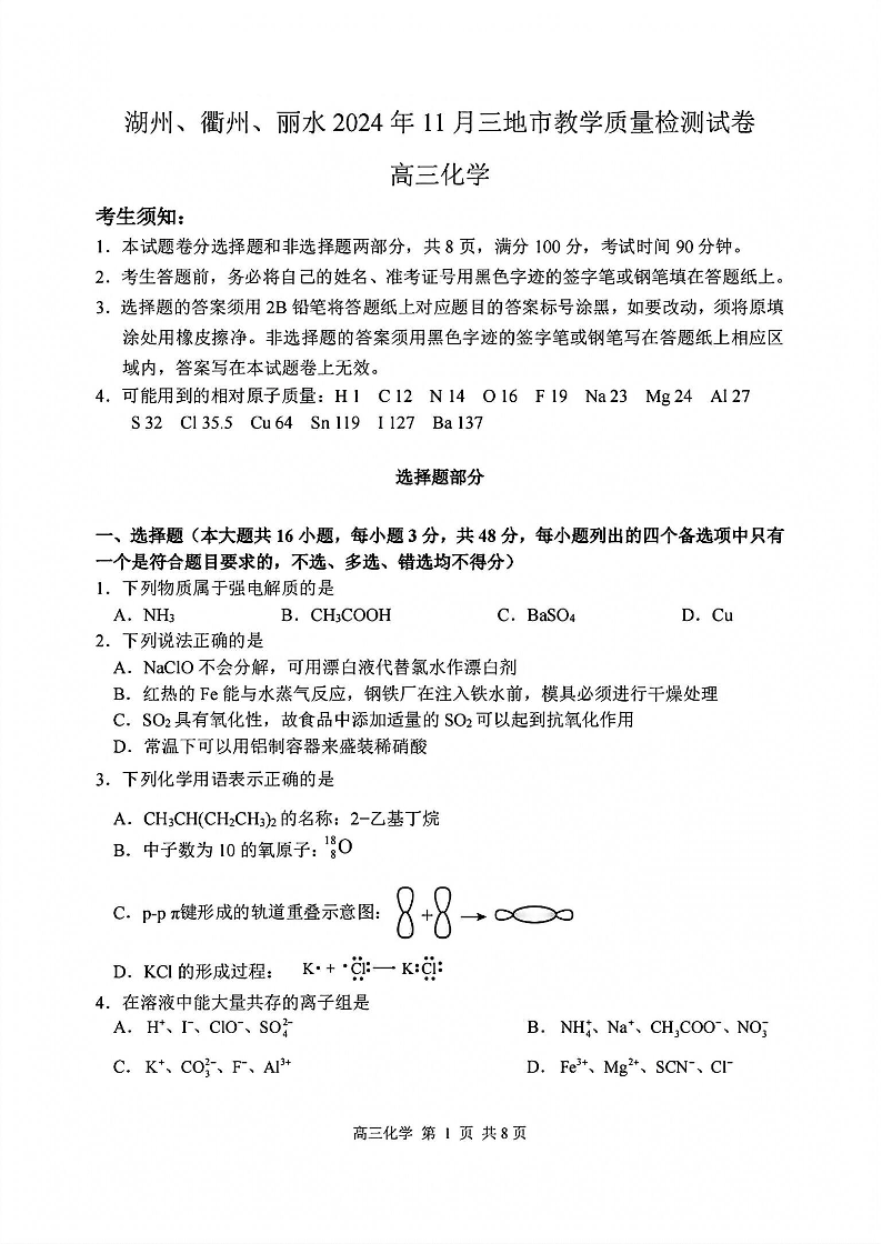 浙江省湖丽衢2024年11月三地市教学质量检测试卷+化学