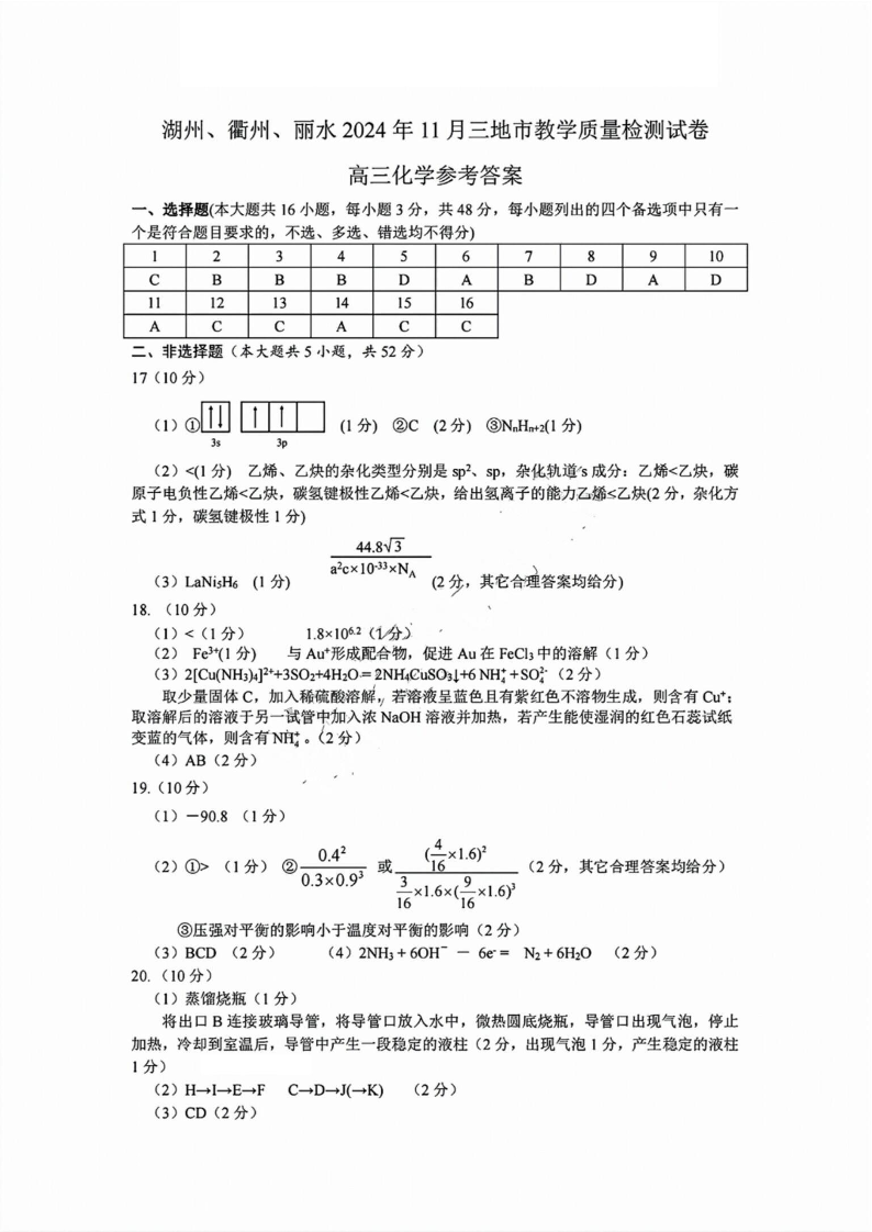 浙江省湖丽衢2024年11月三地市教学质量检测试卷+化学答案