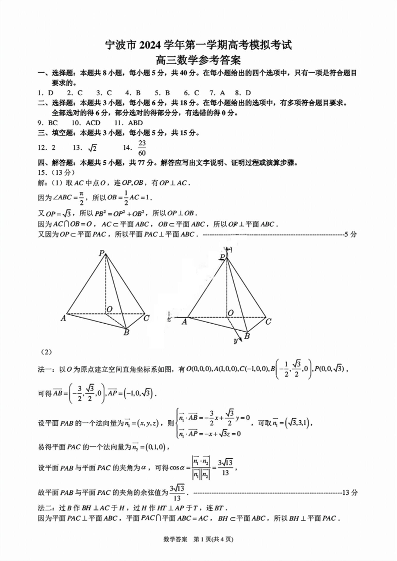 宁波市2024学年第一学期高三模拟考试+数学答案