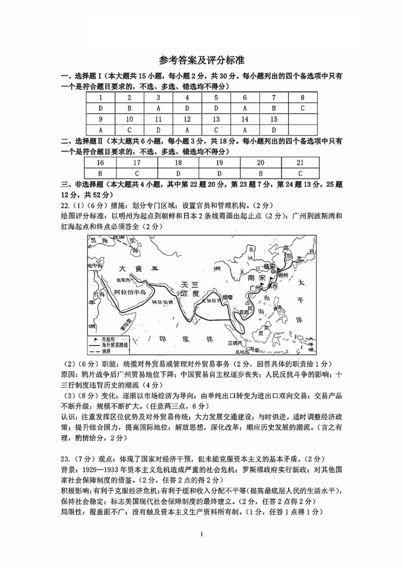宁波市2024学年第一学期高三模拟考试+历史答案