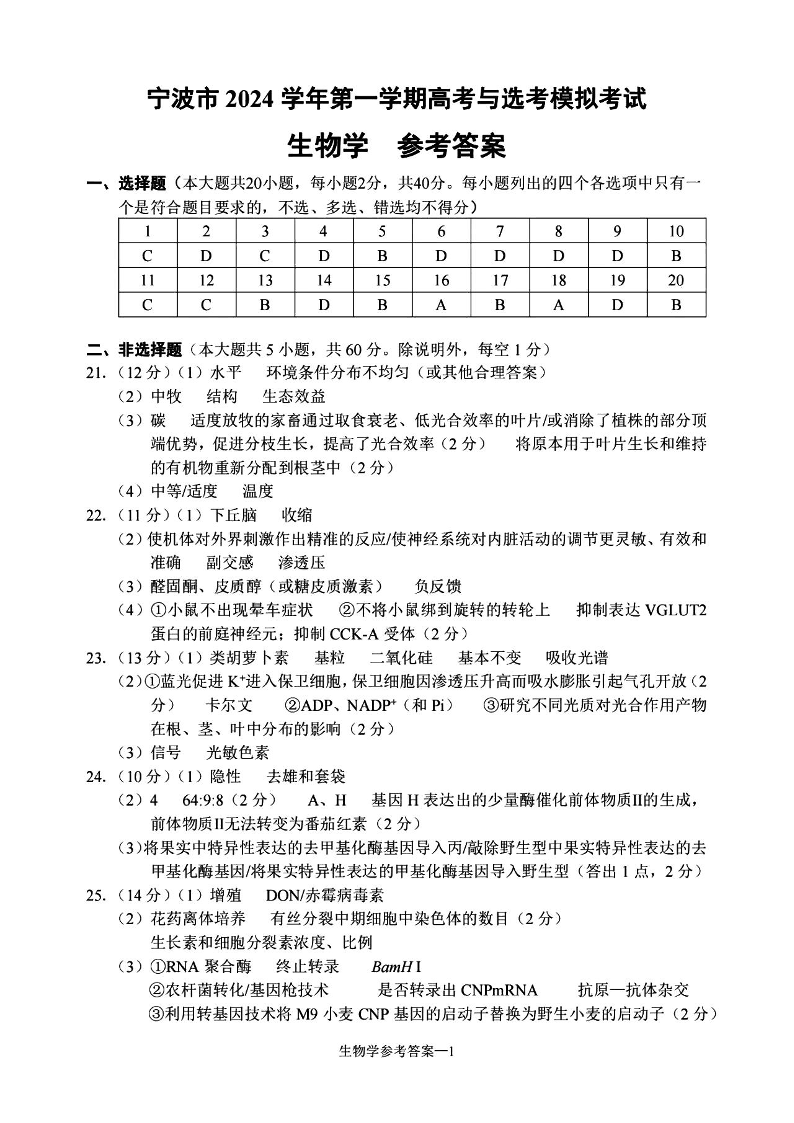 宁波市2024学年第一学期高三模拟考试+生物答案
